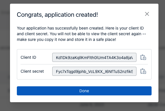 Once the application is created, copy your Client ID and Client Secret and store them in a secure location.These credentials allow access to your firm’s data. Treat them like a password.You can click the clipboard icon to quickly copy each value.